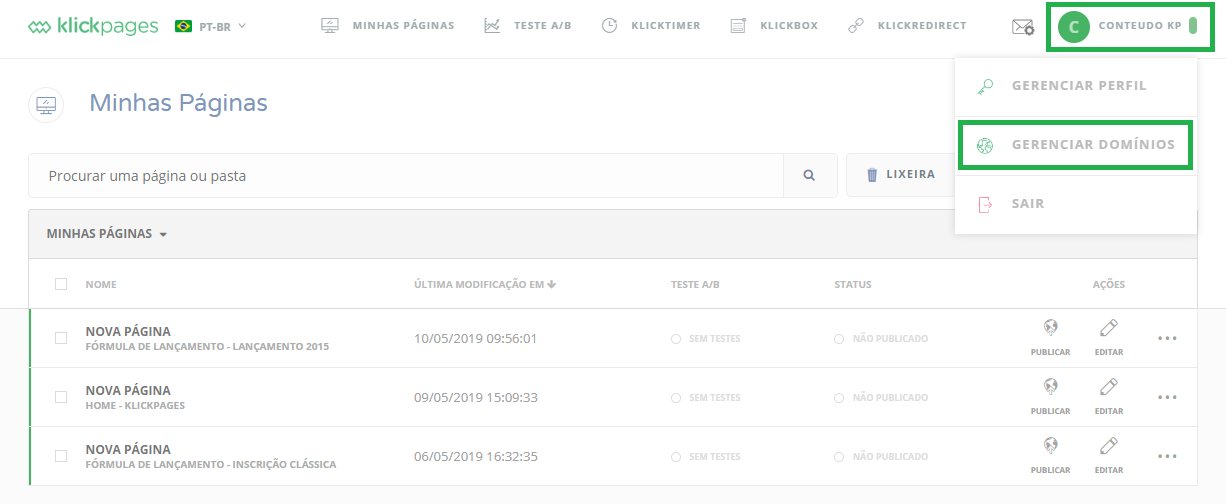 Para adicionar um domínio no Klickpages, você deve fazer o login na sua conta e acessar o menu de Gerenciar Domínios: