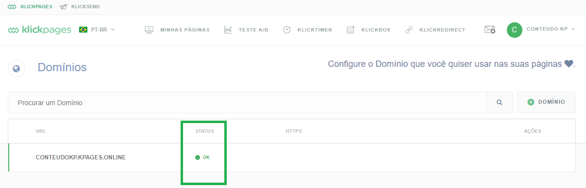 O domínio poderá ser usado quando estiver com um OK e uma bolinha verde no Status, como na imagem abaixo: